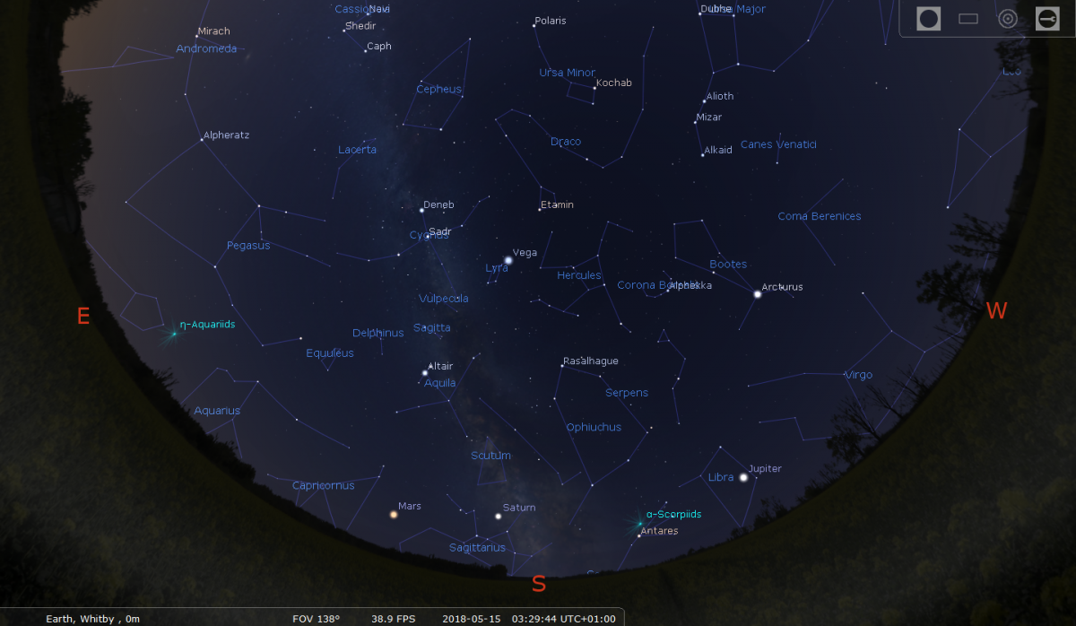 Eta Aquarids have a ZHR (zenith hourly rate) approaching 30, but with Aquarius only just rising in the SE shortly before dawn, observations from the UK are restricted. The radiant of the shower lies close to eta Aquarius, one of the stars making up the "water jar" in the otherwise faint constellation of Aquarius. View around 04:00h when the setting moon will be low to the WSW.