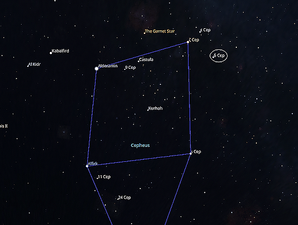 Location of the Garnet star and Delta Cephei in Cepheus. (Click for full image)