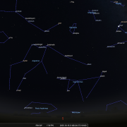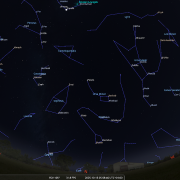 The eastern aspect of the sky is dominated by just a few constellations, particularly the winged horse Pegasus, which stands 2-3 hand-spans above the horizon.  It is best identified by autumn's signature asterism the “the great square”, an arrangement of four stars enclosing a large area of sky seemingly devoid of naked eye stars.  The asterism is particularly useful as a signpost to those fainter constellations visible low to east and southeast.