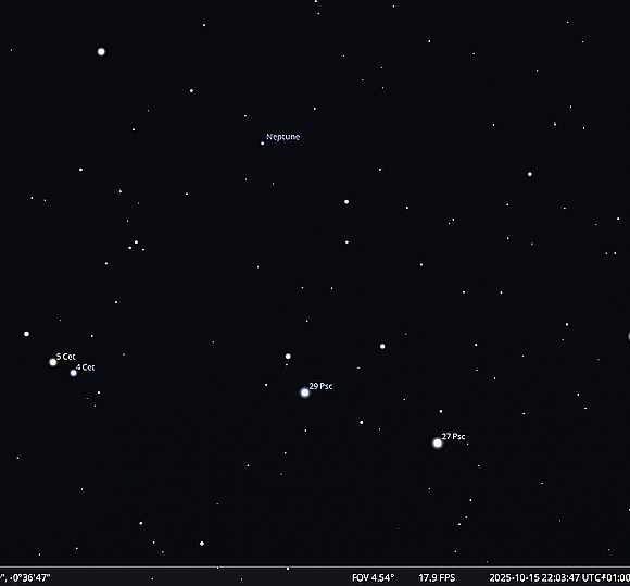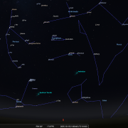 Neptune is well placed for telescopic observation having reached opposition last month. The outermost planet can be tracked down approximately two-degrees upper left of Saturn. With a magnitude of +7.8, Neptune is observable with binoculars, although a telescope is necessary to discern its small blue-grey disk, which measures 2.8 arc-seconds in diameter. Instruments of 100mm (4") aperture are generally adequate for this but telescopes exceeding 150mm (6") will reveal it more clearly.
