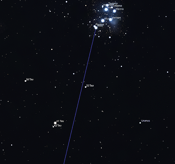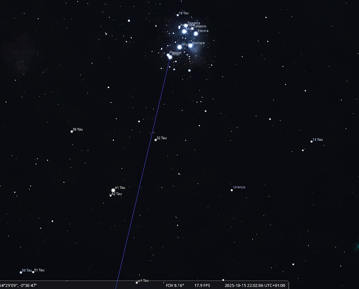 Uranus lies in Taurus, approximately five degrees below the Pleiades star cluster. It is located roughly midway between the star pairings of A1 & A2 Tau and 13 & 14 Tau. With a magnitude of +5.8, Uranus is technically visible to the naked eye under very dark skies but will be a tricky spot from UK shores. Through binoculars, Uranus appears as a faint point, telescopes with apertures of at least 80mm (3+ inches) are necessary to resolve its small 3.7 arcsecond greenish disk, which becomes more distinct in instruments of 150mm (6”) or larger.