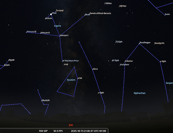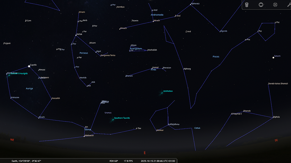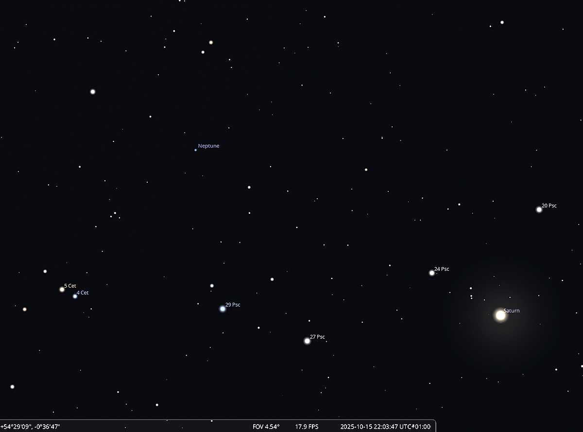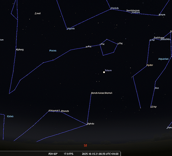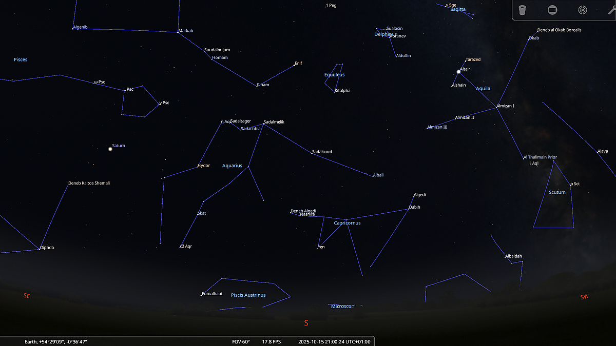 Saturn is already clear of the horizon as darkness falls at the beginning of October, favourably placed in the SE by 21:00hrs. By the time clocks go back in the UK on October 26th Saturn will be crossing the meridian - due south by 21:30hrs, ideally placed for observation. It culminates a respectable 33 degrees above the horizon - still a few degrees shy of the celestial equator which it finally crosses in 2026. Residing amongst the faint star of Aquarius, at magnitude +0.7 Saturn will stand out in a region of the sky devoid of brighter stars.