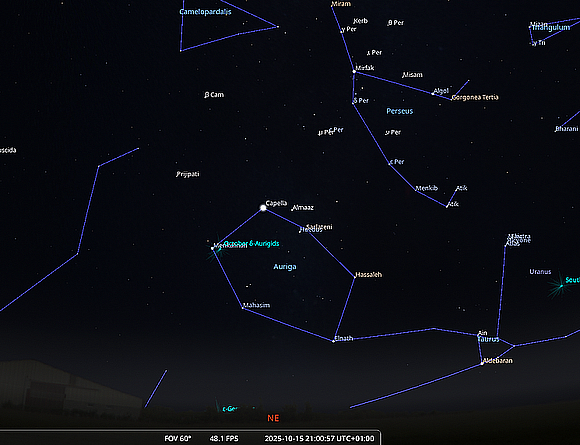 Following Perseus, climbing away from the NE horizon is the brilliant star Capella, chief luminary in the pentangle outline of Auriga the charioteer.  Capella is a circumpolar winter star spending its summer low to north before climbing up overhead as winter commences.