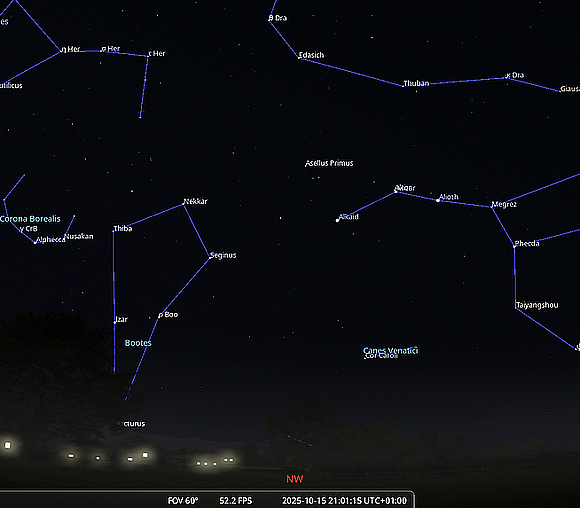 The Northwest aspect of the October night sky - 21:00hrs BST. (Click for larger image)