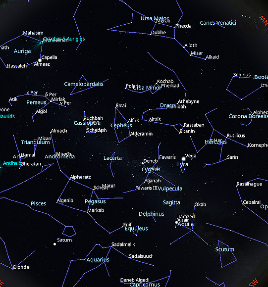 Particularly noticeable are the three bright stars of the summer triangle., the lovely steely blue hue of Vega in the lozenge shaped group of Lyra is most conspicuous high in the NW.