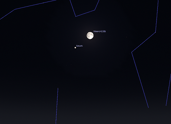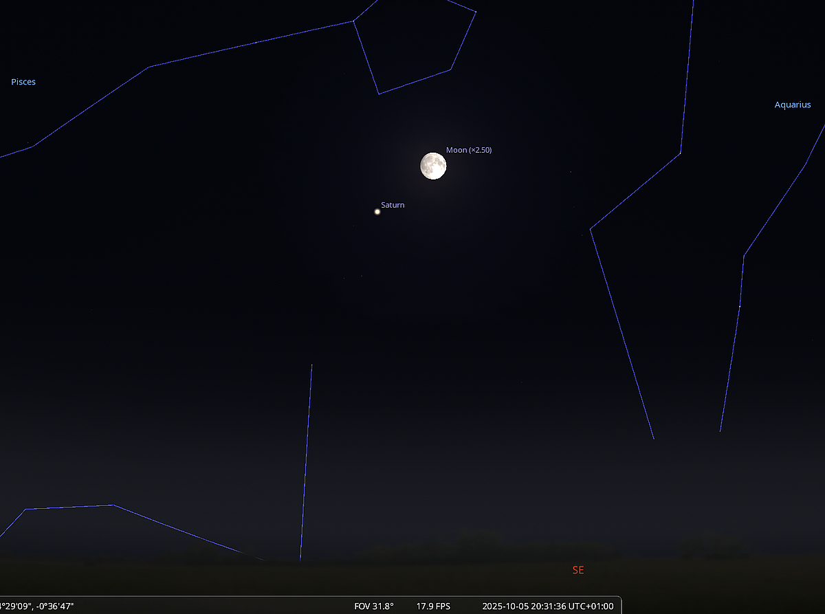 Through the eyepiece Saturn is often a glorious sight but this being a ring plane crossing year currently the tilt of the rings is only around 2 degrees in orientation. By November the rings will be edge on once more. You can spot Saturn's largest moon, Titan, in most apertures, visible as a speck of light nearby. Several more of Saturn’s moons are also visible to 'amateur telescopes' especially when the rings are closed. Rhea, Tethys, Dione should all be glimpsed in instruments above 150mm (6"). On October 5th a Moon resides just below Saturn.