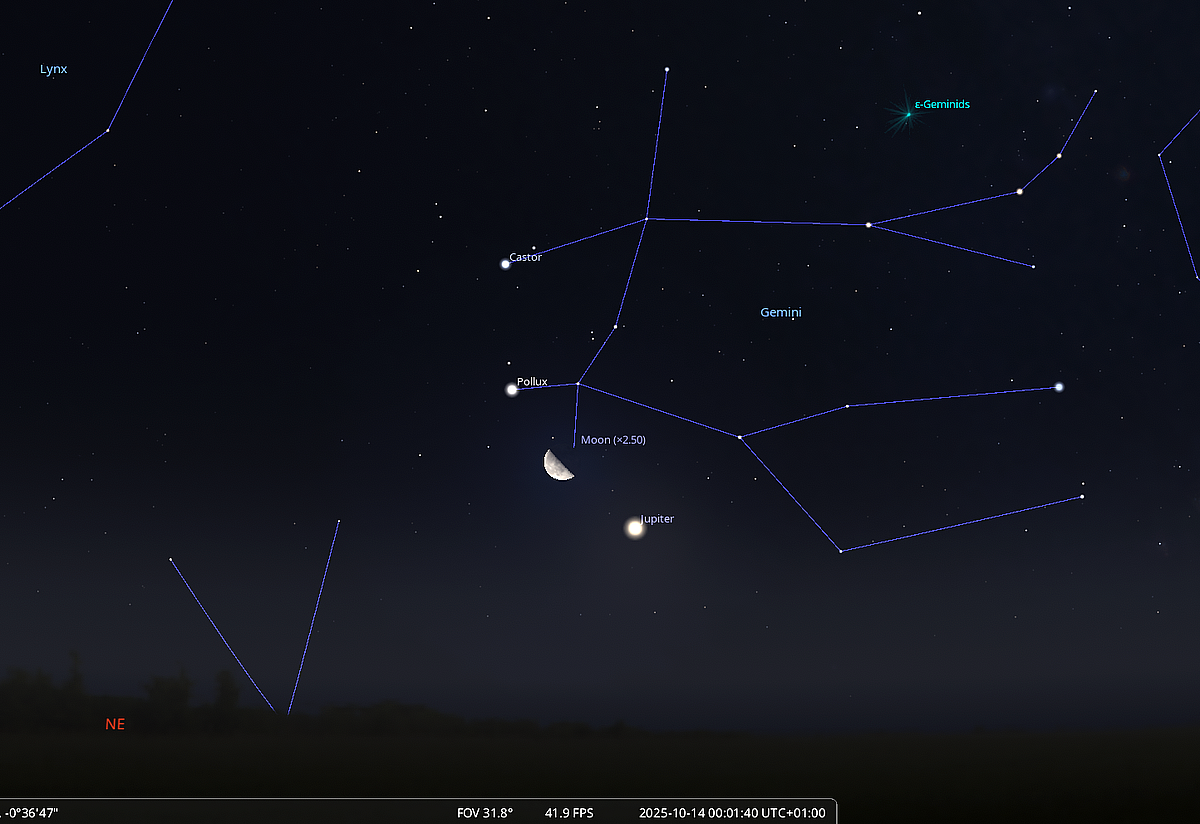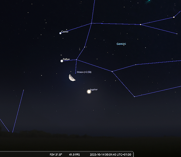 Oct 14th/15th - midnight, Jupiter & Last Quarter Moon. (Click for larger image)