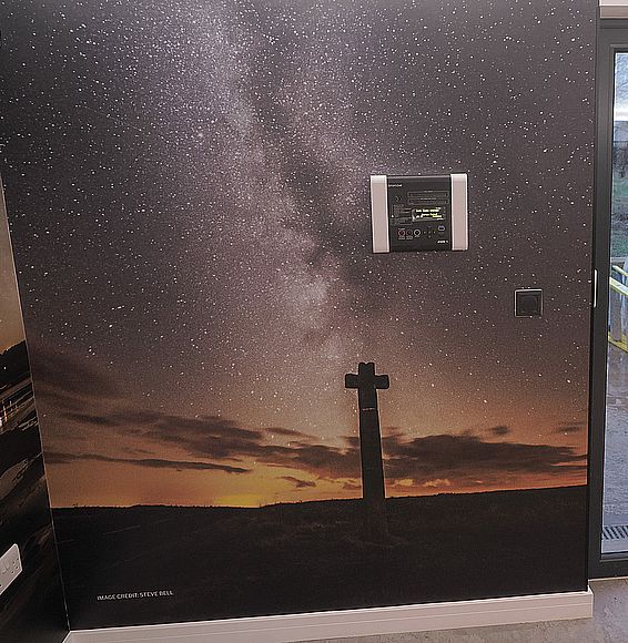 The presentation room can seat 25+ and houses an 86" tv monitor with HDMI connectivity. A large cupboard in one corner is home to the chairs, a lectern and other equipment. The south and west walls have eye catching floor to ceiling images of local views and landmarks with a large full moon superimposed and inspiring text. Lighting, heating, ventilation and sound systems are all adaptable, discreetly installed in the ceiling and wall pelmet and can be controlled via an app. Both the colour rendering and brightness of lighting can be adjusted to suit the environment needs, or mood when being used.