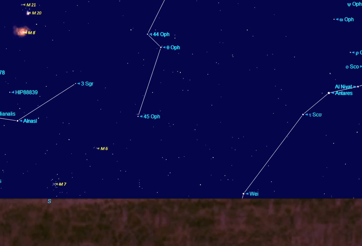- M7 (NGC 6475) another open star cluster in Scorpius, located near the scorpion’s stinger. It has an apparent magnitude of 3.3 and is easily visible to the unaided eye. It is also known as the Ptolemy Cluster because it was the Greek astronomer Ptolemy who first recorded it in 130 AD. Ptolemy believed the cluster to be a nebula. The Ptolemy Cluster contains about 80 stars, the brightest of which has a visual magnitude of 5.6. M7 is approximately 980 light years distant from the solar system. It is roughly 25 light years in diameter. The age of the cluster is estimated to be around 200 million years. Both M6 and M7 are difficult Messier objects to view and appreciate from the UK being so low to the horizon.