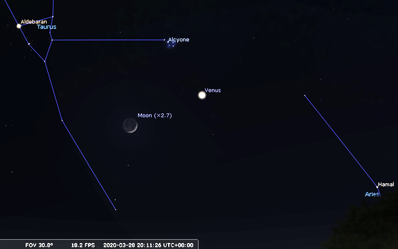 As Venus continues to move up through Pisces and into Aries, it passes Uranus on the 7th approximately 2 degrees to the left of Venus. You will require binoculars to spot fainter Uranus and a telescope to reveal the tiny disk.