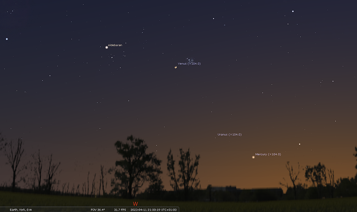 Mercury continues its most favourable evening apparition of 2023 for Northern Hemisphere observers, reaching greatest eastern elongation from the Sun (19 degrees) on April 11th. The elusive messenger of the gods, and innermost planet to the Sun, is always a little tricky to view, but this month Mercury appears just about as far from the Suns glare as it can, considerably boosting the opportunity of tracking it down during the first half of April. At the start of April Mercury shines at magnitude -1.1 (Mercury always appears brightest at the start of evening apparitions and at the end of morning ones). Wait until 35 minutes after sunset before trying to locate Mercury which will reside around 9 degrees above the WNW horizon. A flat, unobstructed W horizon will therefore be helpful. The brilliant planet Venus sits approximately 21 degrees upper left of Mercury (a large hands span at arm's length). Mercury should be visible to the naked eye, but if conditions are still a little too light, use binoculars to pick it out of the twilight. As twilight deepens Mercury should become readily apparent.