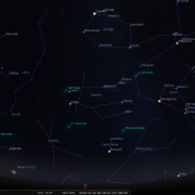 Uranus resides in Aries well placed in the SSE during the evening. Although technically visible to the naked eye at Mag +5.8, in reality binoculars, or better still, a telescope are needed to spot it. Uranus resides just within the borders of Aries quite some distance below the ‘crooked line’ asterism of the Ram. If you have a constellation chart or App etc, use Mesarthim and Iota Aries as pointers to locate Uranus, which resides 3 times the distance between these stars and a tad to the right, below them. Through a telescope Uranus resembles a very small disk of subtle grey/green hue.