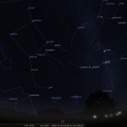 Saturn continues to slide down toward the horizon and is lost by the end of the month. Look for a very slender crescent Moon in this part of the evening sky from the 27th to 29th.