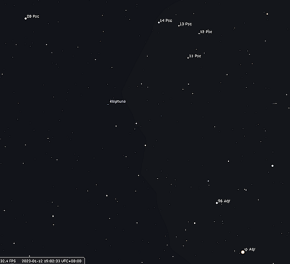Remote Neptune is quite well placed for observation in the evening sky residing amongst the stars of northern Aquarius, some 6 degrees lower right of Jupiter. At a distance of 4.32 billion Km, Neptune appears a feeble magnitude +7.8 object, visible in binoculars as a speck only, a telescope with an aperture of at least 100mm (4") + is required to reveal its tiny blue/grey disk barely 2.5 arc seconds in diameter. Although Neptune resides just within the borders of Aquarius, the closest visible star is the mag +5.5 star 20 Piscium (HIP 117375) with 96 Aqr almost the same distance to the SW of Neptune. By the month’s end Neptune is setting by 21:30hrs.