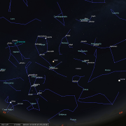As darkness descends the southern and western aspect of the night sky is still dominated by autumnal constellations and even a number of circumpolar summer groups. The great square of Pegasus occupies much of the higher regions of the SSW, below which reside the less conspicuous constellations of Pisces and Aquarius. Cetus the whale continues to churn along the South horizon below Pisces; slipping below the horizon by midnight later in the month. Use the front two stars in the square to locate the 'Krakens' brightest star Diphda.
