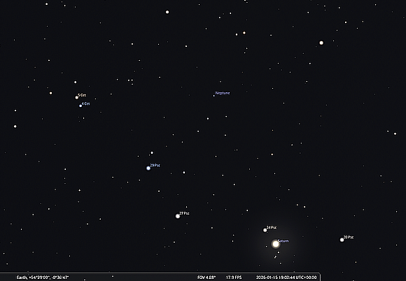 Neptune is well placed to track down in the early evening sky until mid-month, thereafter it will become increasingly mired in poorer seeing. Neptune has a magnitude of +7.8 and is visible as a faint ‘star’ when viewed through binoculars. A telescope will be required to positively identify the outermost planet, its tiny 2.8 arcsecond blue-grey disk visible in instruments of 100mm (4") aperture employing high magnification. Apertures exceeding 150mm (6") will reveal it more clearly. Starting the new year approximately 3-degrees upper left of Saturn, this separation diminishes to 1 degree 45-arcminutes by the end of January as Saturn creeps closer to Neptune in prograde motion. The nearest designated stars to Neptune are 29 & 27 Psc, both 5th magnitude and only just visible to the naked eye from semi urban sites. Like Saturn, Neptune is setting by 20:30hrs by the end of the month.