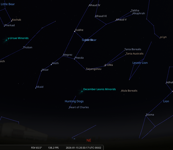 Minor Quadrantid activity ranges from late December until Jan 12th, but rapidly diminishes to sporadic levels after Jan 6th. During the evening of January 3rd, the shower radiant is positioned low to the North and few meteors will be seen. The short-lived peak occurs in the early morning hours of the 4th, by which time the radiant will be positioned over 40 degrees above the ENE horizon.