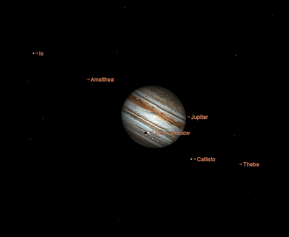 The most favourable evening shadow transits in January are Io - Jan 7th & 30th @ 21:30hrs and Jan 23rd @ 20:00hrs. Europa - Jan 11th @ 18:30hrs & 18th @ 21:30hrs. In the early morning hours, a rare transit of Callisto occurs on Jan 27th between 02:00hrs - 04:00hrs. A transit of Ganymede, with Ganymede itself present occurs on Jan 7th, 02:30hrs - 05:00hrs.