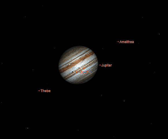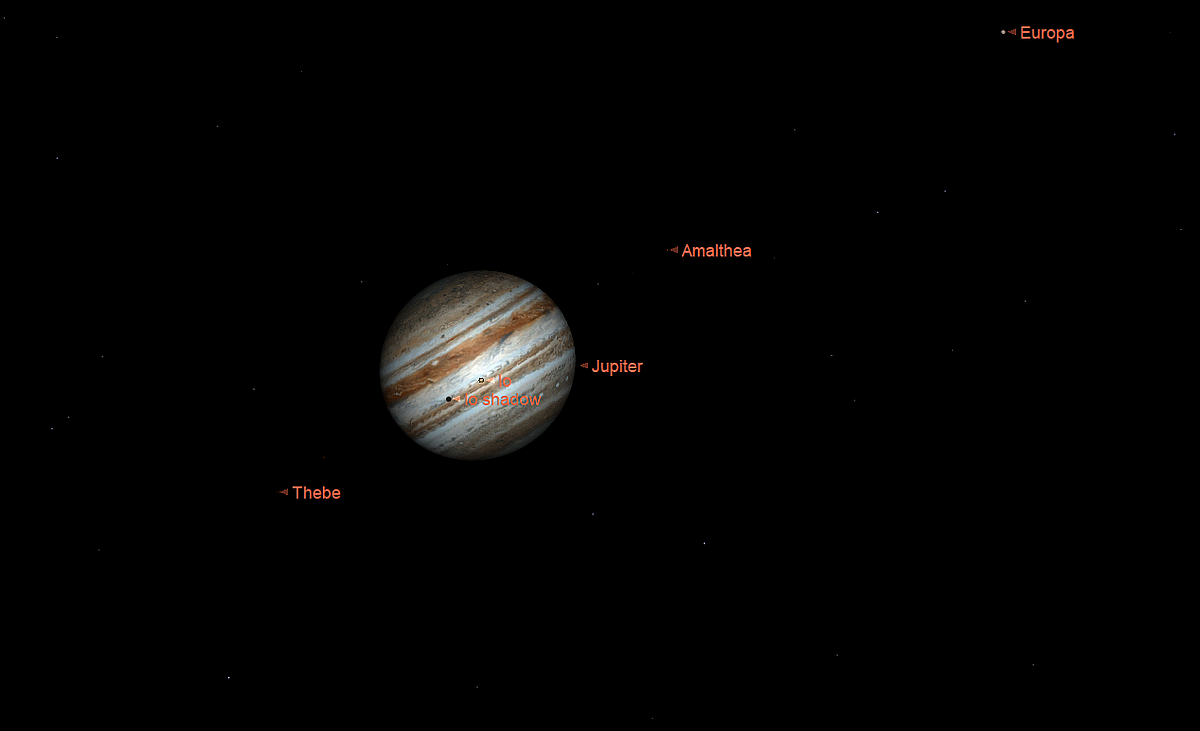 At magnitude -2.68 Jupiter is obvious to the naked eye, by far the brightest object in the night sky (Moon aside). ). It is a 'must see' object whatever sized observing instrument employed, exhibiting an oblate disk some 47 arcseconds in diameter crossed by darker belts and zones. The darker equatorial belts will be readily visible in instruments of 60mm (2.5”) aperture, with the less evident polar regions apparent in 80mm (3.4") instruments. Larger apertures show increasingly finer details including the northern and southern temperate belts. Surprisingly, for the largest planet, Jupiter's rotational period is just under 10 hours and given that the nightly observing window exceeds 10 hours all month, one full rotation may be observed.
