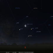 Mars and Saturn reside in the dawn sky – located to the south around 05:00h. Mars has an obvious orange hue, whereas Saturn, which resides to the left of Mars, will have a pearly white lustre. Both should be quite conspicuous. With Mars not reaching opposition until late May its disc is still rather small when viewed through a modest telescope. As the Earth draws closer matters will improve with general surface detail on Mars becoming more apparent. The Moon lies nearby on the 29th.
