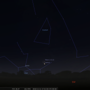Venus makes a dazzling return into the dawn sky and will be visible low in the SE aspect. If you view around 06:30h throughout the month, notice how Venus glides up to the bright star Spica in Virgo, reaching it by the 16th, before turning to the east and moving away. A very slim waning Moon lies off to the upper left on the 6th.
