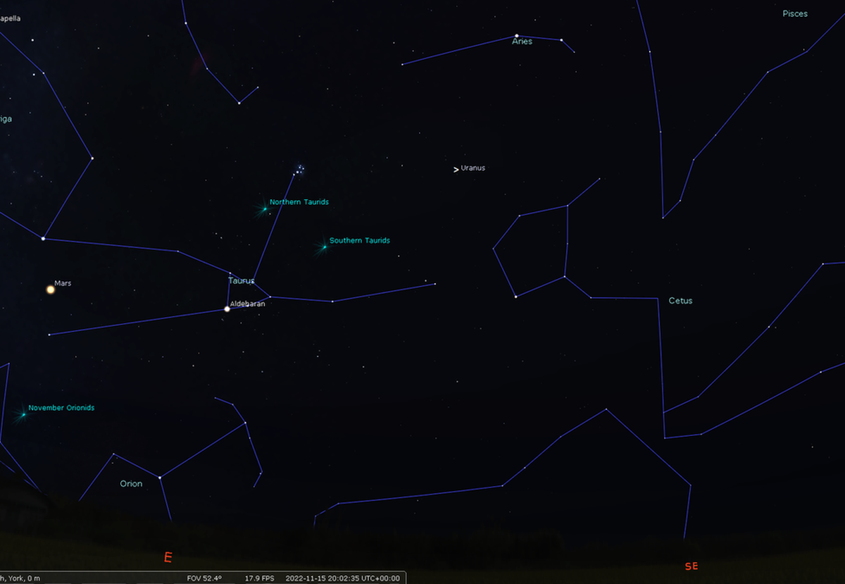 The Leonids are active from Nov 15-20th, peaking over the night of the 17/18th in 2022. The actual peak activity time for the shower is predicted to be around 23:00hrs UT on Nov 17th, however from the UK, Leo, in which the radiant of the shower resides, is only just rising at that time. The early morning to pre-dawn hours should therefore yield the higher rates when Leo culminates in the south of the sky as dawn breaks. There is a catch though (as seems to be the case this year with all meteor showers), with a waning crescent Moon present in Leo 25 degrees away from the radiant. Normally spotting meteors occurs well away from the location of the radiant itself, so it may not interfere to the complete detriment of the shower, we shall see, clouds permitting.