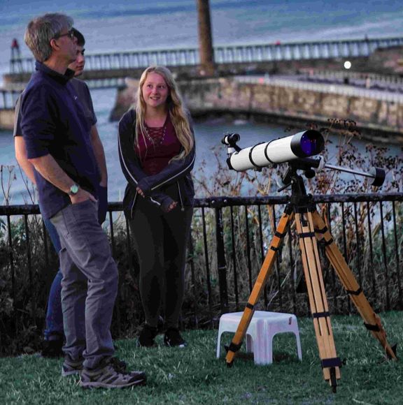 Keith and Mark at the COM for what was a really enjoyable evening with decent crowds (many there for the Yorkshire Traction fireworks display from Whitby Laithes), but quite a few sat waiting having seen the advertising board. Three scopes were employed -10" dobsonian, 8" dobsonian and a Tal refractor. Poster boards were arrayed against the railings providing a backdrop, encouraging people to wander over and leading to a classic star party vibe. The Moon was low - hiding amongst the chimney stacks adorning the Royal Hotel, and we had to relocate the scopes several times to access a view. The Moon was however not the main observing target, this would hopefully fall to Saturn, visible at last above the SE horizon. It was a nervous wait, but then, there it was and actually not bad in the eyepiece. People were thrilled to view the ringed wonder, and queues formed at the eyepieces. Stars were targeted, then by 22:20 a conspicuous orange beacon was spied above the sea - just off the east cliff face. Distant plane? Chinese lantern? A planet - Jupiter?  We deliberated, Yes it was Jupiter rising. The image was like jelly, but you could not mistake the oblate disk and even Galilean Moons, passers by and those remaining were still enthralled nevertheless. By 23:00 it was time to call it a night, a good evening all round.